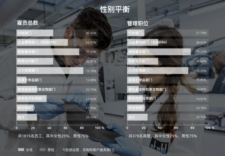 上述数值为斯塔尔整体的结果,实际上各部门的具体比例之间存在很大的差异。例如,在生产运营部门(表格中的“供应链”)和斯塔尔皮革化学品销售部门中,男性的比例明显高于女性。不过,这两个部门的工作内容从传统意义上来说就对女性的吸引力比较小。除去这两个部门后,2022年斯塔尔女性员工的占比为25%,管理岗位上的女性占比为75%。
